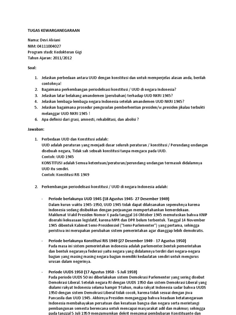 Apr 10, 2018 · sebelum amandemen uud 1945, mpr adalah lembaga tertinggi negara, di mana lembaga eksekutif dan yudikatif berada di bawah kekuasaannya. Nov 10, 2016 · 1. Bab 1 konstitusi republik indonesia serikat ini terdiri atas enam bagian. Apr 25, 2017 · demonstrasi dan tuntutan ini disebabkan oleh ris yang akan mengacaukan persatuab dan kesatuan. Sementara itu, dalam proses perubahan konstitusi pasca kembalinya ke uud 1945, indonesia telah melakukan setidaknya empat kali amandemen.